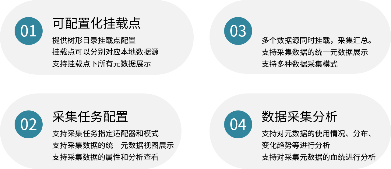 一、数据采集中间件使用大数据中心采集平台配置分级目录和挂载点,并允许设置多样化数据源,对元数据信息进行采集,分类,整理,并按照目录分类形成数据集市,为资源目录展示及数据交换共享提供基础。