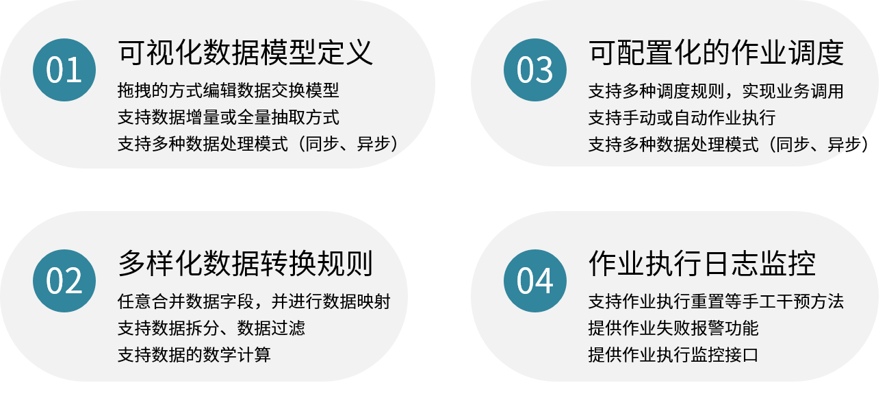 二、数据交换中间件使用大数据中心交换平台提供的集成开发工具,进行数据集成建模,配置数据交换规则,制定数据交换作业,创建作业计划,手动或自动执行数据交换,将源数据库数据交换至目标库,为数据采集和业务分析提供数据支撑。