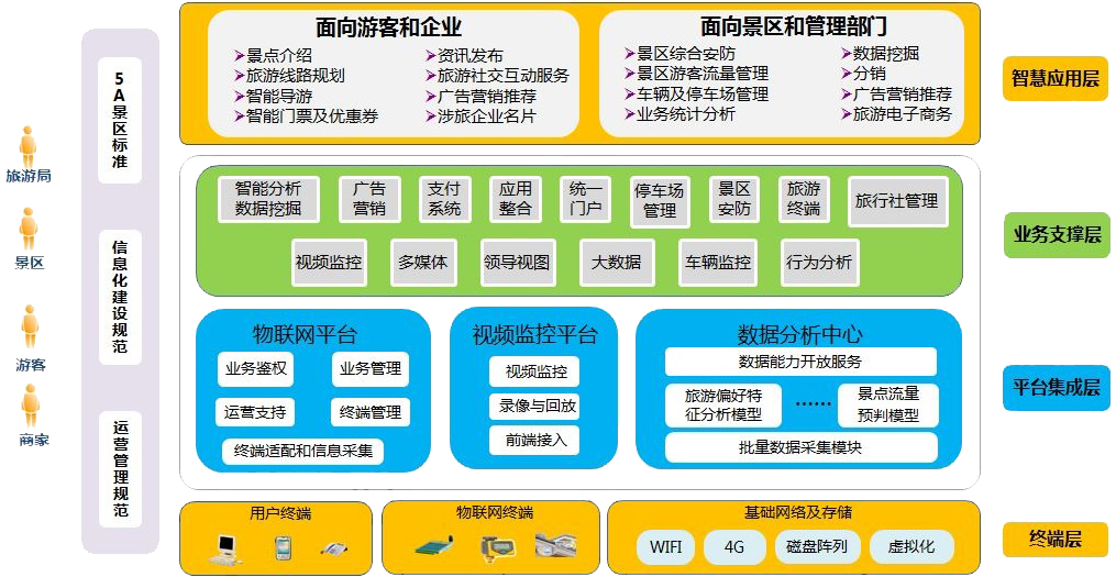 系统采用分层式架构,集成高清监控设备、固定与移动终端、智能安防设备、物联网传感器,结合大屏可视化技术,构建全方位数据感知与业务支撑体系。依托无线通信技术,实现景区动态监测、游客行为分析、智能调度与安全管理。平台面向游客、商家、景区和旅游管理部门,提供智能导览、客流监测、电子商务、应急预警等智能化应用,并支持定制化扩展,满足不同客户需求,助力旅游行业向 数字化、智慧化、精细化 发展。